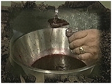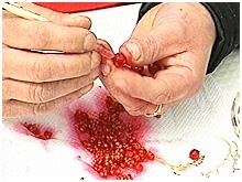 先を尖らせたガチョウの羽で、ひと粒ひと粒、小さな種を取り出していきます。 種が残っているとジャムの品質が落ちるので、この作業はとても大切。 |
