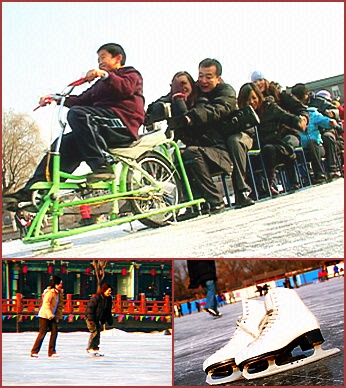 スケート靴の他に自転車や椅子を改良して作られた“ソリ”もレンタルされている。后海に氷が張るのは12月下旬〜2月下旬。