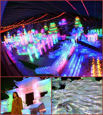 氷のブロックを積み重ねて作られた氷の建物が多数展示され、自由にその中に入る事が出来る。また氷で作られた滑り台や迷路などの遊具もある。