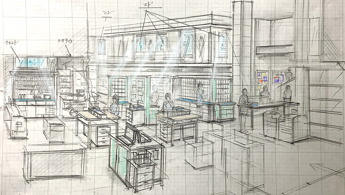 調剤は手元の作業が中心なので、映像的に厳しい。となると、足の動きで画を作り上げていく必要が出てきます。役者さんたちのせわしない動きで薬剤師の忙しさを見せていく、ということになったので、人がたくさん動けるセットにしようと考えました。
