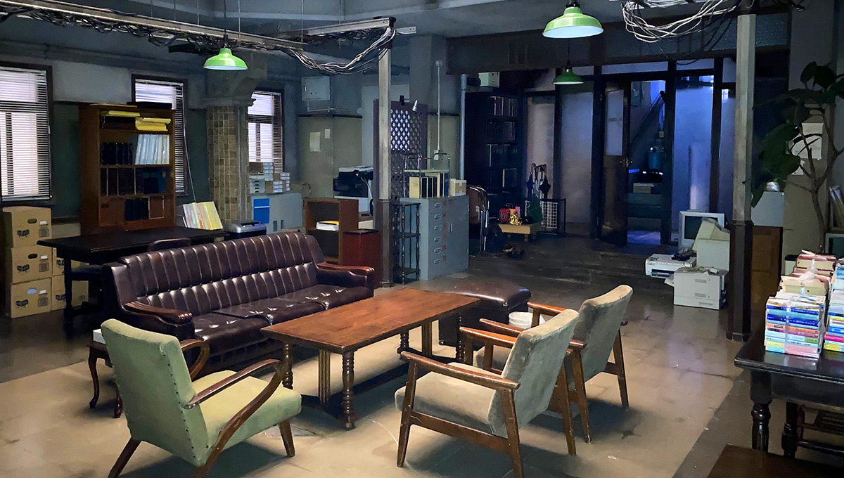 ボロボロの事務所で「もらっても、ほどほどに要らない物件」というイメージです。この“ほどほどに”のニュアンスで苦労しました。“昭和感”満載のボロい物件というよりは、少し外国映画っぽいクラシックなところもある落ち着いた空間を目指したのですが、バランスが難しい。一度本当にボロボロのソファを置いてみたのですが、監督から「やり過ぎ」と言われてやり直したこともありました。構造的には正面奥がロフトになっているのが特徴で、手前と奥の芝居ができるようにしています。