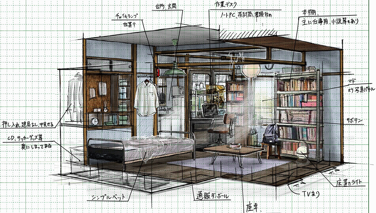 全体的にはモノトーンで、あまり人と関わらない仕事をしながら淡々と暮らしているというイメージ。作業デスクと本棚に囲まれた空間が彼の主な居場所です。あと気付かないと思いますが、デスク奥の窓辺に小さなサボテンの鉢があるんです。そんな生活だけどサボテンは育てている、みたいな感じもいいかなと思って。監督に言ったら「任せる」とのことでしたので。密かなこだわりです(笑)。