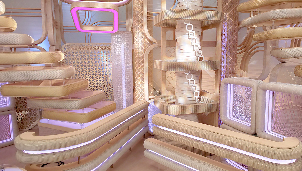 色味は床も含めて全体的に、抑えめのナチュラル色にしています。番組タイトルロゴは昼の『days』がピンク、夕方『it!』は黄色、夜の『α』で紫を使っていますが、セット内の大型LEDビジョンに映すロゴが映えるよう、あえて薄いベージュやアイボリーなどの控えたトーンの色でまとめました。