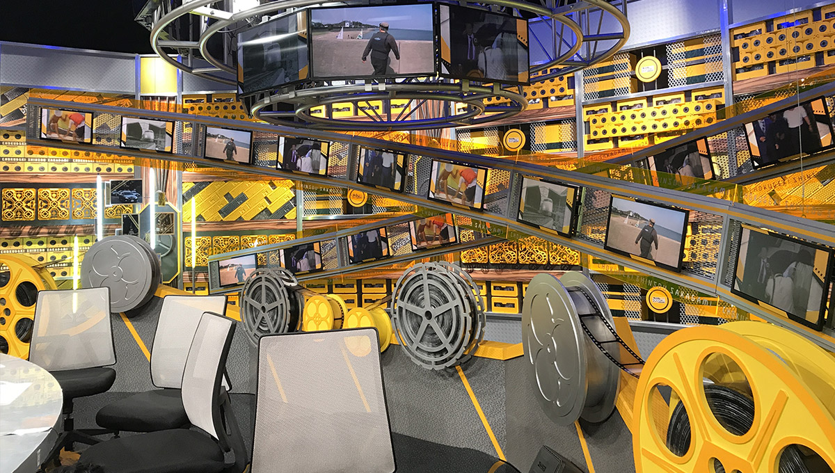 色味以外では、モニターが多くてともするとニュース番組のようなお堅い雰囲気のセットになってしまうので、多少バラエティ寄りにするために、実物でない、作り物を入れようと考えました。それで作ったのが、映画フィルムの大きいオブジェです。こういった非現実的な物が入ると、硬派な印象からグッと和らぐんです。