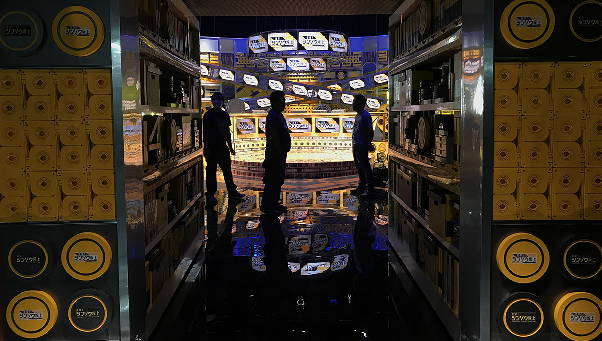 「映像」に直結するリアル素材を贅沢に使っているところでしょうか。本物のベータカムビデオテープとPCのキーボードを大量に集めて、スプレーで黄色に塗り、MC・パネリストの後ろやカウンターの下に並べています。もちろん廃材を使っていますが、それにしても贅沢な使い方だと我ながら思います(笑)。