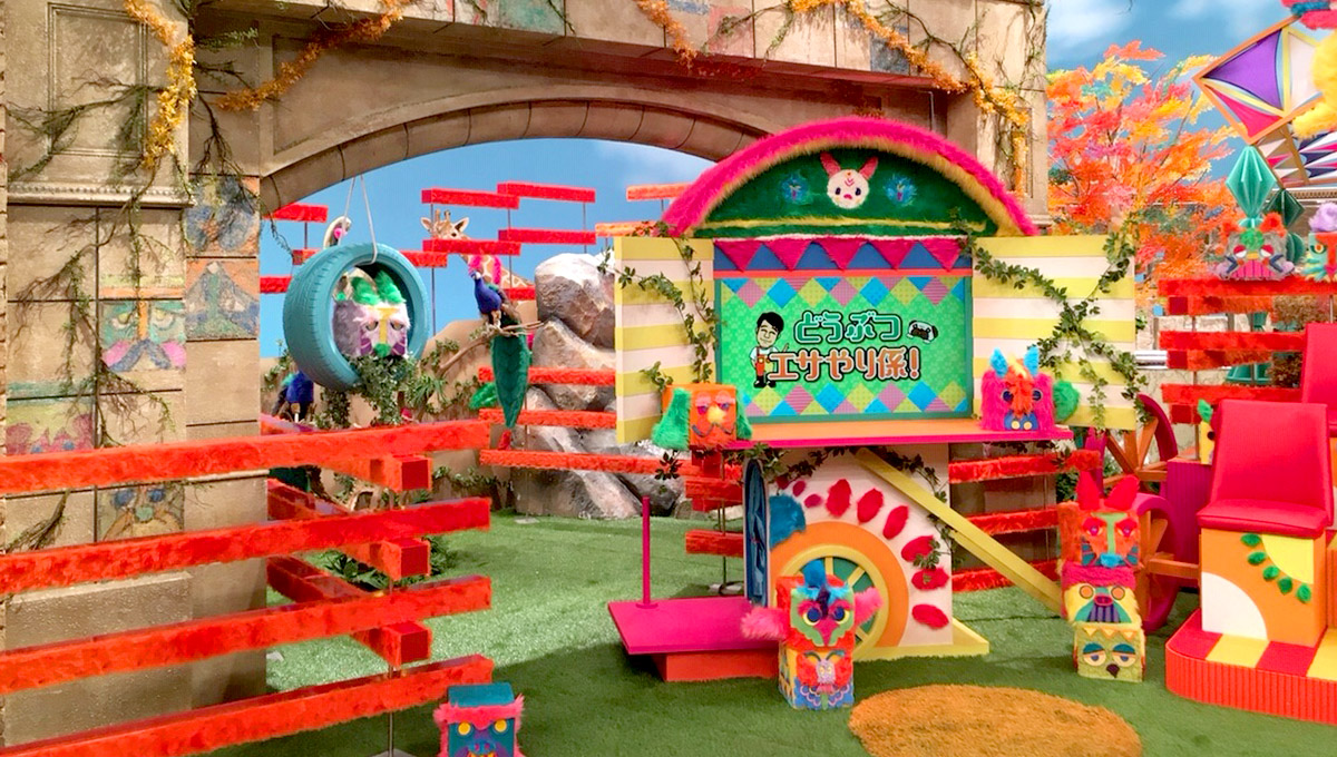 この番組は「大の動物好きの坂上忍さんが理想の動物王国を作る」というプロジェクトがベースにあるもので、プロデューサーからは初めに、「“動物王国”なので、広大な牧場をイメージしたセットで」と言われました。そこで人工芝をベースに敷くことにしましたが、牧場そのままでは面白味に欠けるので、ふれあいキャラバンのイメージも重ねました。出演者席の椅子はキャラバンワゴンの座席風にして、スタジオ全体のベースカラーはオレンジ。明るくポップな感じを出したくて。そこに、あたかも奥に動物の国が広がるようなアーケード風の屋根とアーチを置いて、今のセットに落ち着きました。