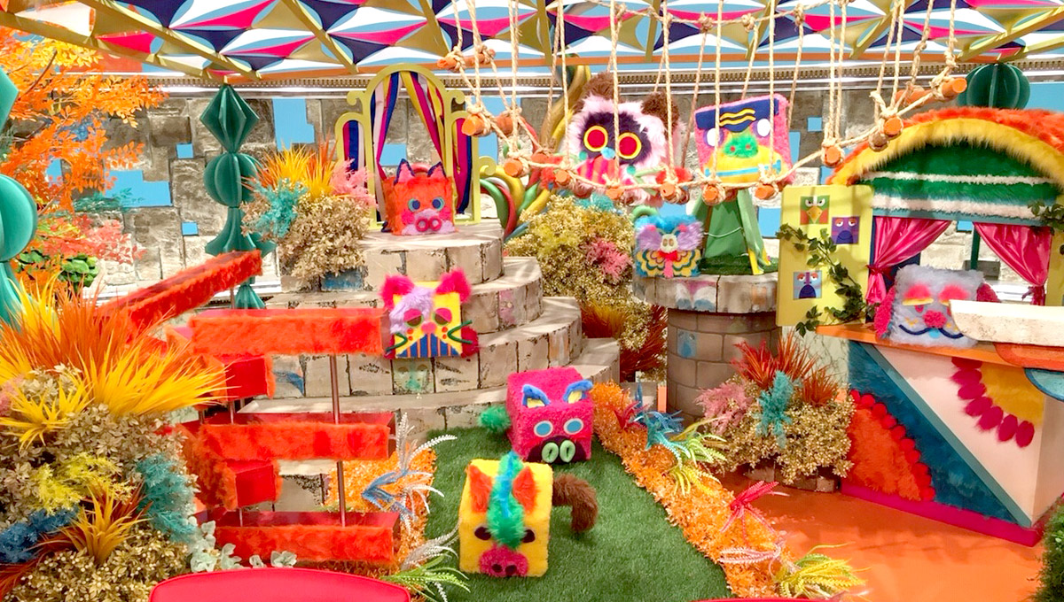 一つは、セットのところどころに置いている、四角い動物の飾りです。いろいろな動物が登場するので、飾りもあえて特定の生き物に見えないように四角で作って、スタッフの間では「キューブ動物」と呼んでいます。ロケに出るゲストが持つスーツケースも、周り一面をファーで覆って、大きな「キューブ動物カバン」にしました。