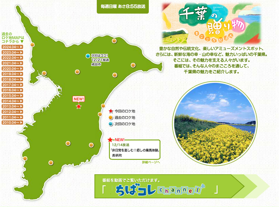 NEW! 12/14放送「非日常を楽しむ!癒しの乗馬体験」長柄町 NEW! 12/14放送「非日常を楽しむ!癒しの乗馬体験」長柄町 12/7放送「里山リゾートで宿・食・湯を満喫!」いすみ市 11/30放送「ガラス工房で感動の思い出作り」鴨川市 11/23放送「プロのガイドが伝える鋸山の魅力」富津市/鋸南町 11/16放送「クラフトビールで観光拠点に!」大網白里市 11/9放送「白みりんがテーマの体験型ミュージアム」流山市 11/2放送「ラーメン店の絶品クラムチャウダー」船橋市 10/26放送「渓谷の景観を楽しむ温泉宿」大多喜町 10/19放送「こだわり卵の濃厚スイーツ」旭市 10/12放送「発酵にこだわる和食処」香取市 10/5放送「豪快料理でもてなす宿」白子町 4/13放送「ご当地グルメ!新鮮もつの『滋養めし』」横芝光町 4/6放送「伝統工芸!東京手描友禅」佐倉市 過去の放送内容(2024.04~2025.03)はこちら 過去の放送内容(2023.04~2024.03)はこちら 過去の放送内容(2022.04~2023.03)はこちら 過去の放送内容(2021.04~2022.03)はこちら 過去の放送内容(2020.04~2021.03)はこちら 過去の放送内容(2019.04~2020.03)はこちら 過去の放送内容(2018.04~2019.03)はこちら 過去の放送内容(2017.04~2018.03)はこちら 過去の放送内容(2016.04~2017.03)はこちら 過去の放送内容(2015.04~2016.03)はこちら 過去の放送内容(2014.04~2015.03)はこちら 過去の放送内容(2013.04~2014.03)はこちら 過去の放送内容(2012.04~2013.03)はこちら 過去の放送内容(2011.04~2012.03)はこちら 過去の放送内容(2010.10~2011.03)はこちら ちばコレchannel