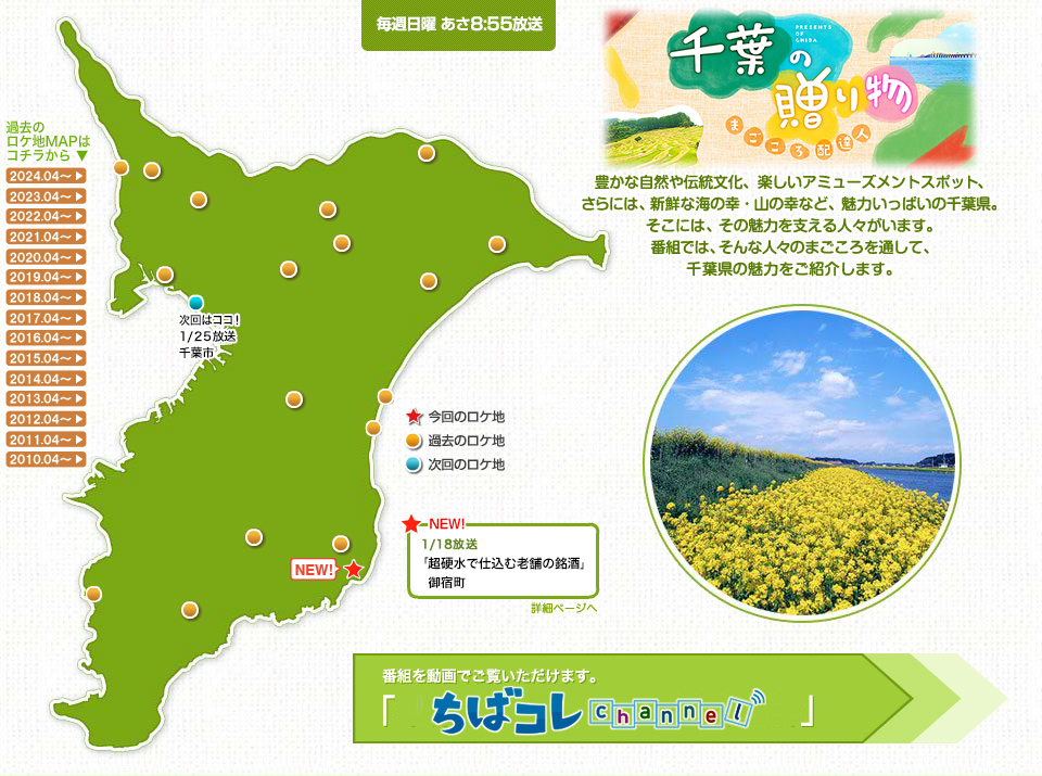 NEW! 1/18放送「超硬水で仕込む老舗の銘酒」御宿町 NEW! 1/18放送「超硬水で仕込む老舗の銘酒」御宿町 1/11放送「甘みが強い!富里にんじん」富里市 1/4放送「冬の味覚!しろいの自然薯」白井市 12/28放送「元プロボクサーのこだわりキーマカレー」柏市 12/21放送「伝統の味を受け継ぐうなぎ専門店」成田市12/14放送「非日常を楽しむ!癒しの乗馬体験」長柄町 12/7放送「里山リゾートで宿・食・湯を満喫!」いすみ市 11/30放送「ガラス工房で感動の思い出作り」鴨川市 11/23放送「プロのガイドが伝える鋸山の魅力」富津市/鋸南町 11/16放送「クラフトビールで観光拠点に!」大網白里市 11/9放送「白みりんがテーマの体験型ミュージアム」流山市 11/2放送「ラーメン店の絶品クラムチャウダー」船橋市 10/26放送「渓谷の景観を楽しむ温泉宿」大多喜町 10/19放送「こだわり卵の濃厚スイーツ」旭市 10/12放送「発酵にこだわる和食処」香取市 10/5放送「豪快料理でもてなす宿」白子町 4/13放送「ご当地グルメ!新鮮もつの『滋養めし』」横芝光町 4/6放送「伝統工芸!東京手描友禅」佐倉市 過去の放送内容(2024.04~2025.03)はこちら 過去の放送内容(2023.04~2024.03)はこちら 過去の放送内容(2022.04~2023.03)はこちら 過去の放送内容(2021.04~2022.03)はこちら 過去の放送内容(2020.04~2021.03)はこちら 過去の放送内容(2019.04~2020.03)はこちら 過去の放送内容(2018.04~2019.03)はこちら 過去の放送内容(2017.04~2018.03)はこちら 過去の放送内容(2016.04~2017.03)はこちら 過去の放送内容(2015.04~2016.03)はこちら 過去の放送内容(2014.04~2015.03)はこちら 過去の放送内容(2013.04~2014.03)はこちら 過去の放送内容(2012.04~2013.03)はこちら 過去の放送内容(2011.04~2012.03)はこちら 過去の放送内容(2010.10~2011.03)はこちら ちばコレchannel