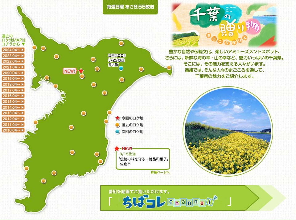 NEW! 3/15放送「伝統の味を守る!絶品和菓子」佐倉市 NEW! 3/15放送「伝統の味を守る!絶品和菓子」佐倉市 3/8放送「地元の恵みを伝える陶芸体験」東金市 3/1放送「街全体が客席!本格コーヒースタンド」市原市 2/22放送「秘境の名店!豪華食材の炭火焼き」南房総市 2/15放送「落花生専門店の絶品ソフト」八街市 2/8放送「鮮魚にこだわる!キンメダイの姿煮」銚子市 2/1放送「完熟いちごが味わえる新名所」木更津市 1/25放送「幕張ゆかりのサツマイモスイーツ」千葉市 1/18放送「超硬水で仕込む老舗の銘酒」御宿町 1/11放送「甘みが強い!富里にんじん」富里市 1/4放送「冬の味覚!しろいの自然薯」白井市 12/28放送「元プロボクサーのこだわりキーマカレー」柏市 12/21放送「伝統の味を受け継ぐうなぎ専門店」成田市12/14放送「非日常を楽しむ!癒しの乗馬体験」長柄町 12/7放送「里山リゾートで宿・食・湯を満喫!」いすみ市 11/30放送「ガラス工房で感動の思い出作り」鴨川市 11/23放送「プロのガイドが伝える鋸山の魅力」富津市/鋸南町 11/16放送「クラフトビールで観光拠点に!」大網白里市 11/9放送「白みりんがテーマの体験型ミュージアム」流山市 11/2放送「ラーメン店の絶品クラムチャウダー」船橋市 10/26放送「渓谷の景観を楽しむ温泉宿」大多喜町 10/19放送「こだわり卵の濃厚スイーツ」旭市 10/12放送「発酵にこだわる和食処」香取市 10/5放送「豪快料理でもてなす宿」白子町 4/13放送「ご当地グルメ!新鮮もつの『滋養めし』」横芝光町 4/6放送「伝統工芸!東京手描友禅」佐倉市 過去の放送内容(2024.04~2025.03)はこちら 過去の放送内容(2023.04~2024.03)はこちら 過去の放送内容(2022.04~2023.03)はこちら 過去の放送内容(2021.04~2022.03)はこちら 過去の放送内容(2020.04~2021.03)はこちら 過去の放送内容(2019.04~2020.03)はこちら 過去の放送内容(2018.04~2019.03)はこちら 過去の放送内容(2017.04~2018.03)はこちら 過去の放送内容(2016.04~2017.03)はこちら 過去の放送内容(2015.04~2016.03)はこちら 過去の放送内容(2014.04~2015.03)はこちら 過去の放送内容(2013.04~2014.03)はこちら 過去の放送内容(2012.04~2013.03)はこちら 過去の放送内容(2011.04~2012.03)はこちら 過去の放送内容(2010.10~2011.03)はこちら ちばコレchannel
