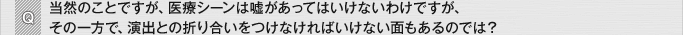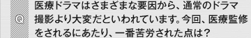 医療のシーンについては、嘘がないこと、それからもっと僕らが本当にやっているようにリアリティーの質を高くしたい、と個人的にはかなり意気込んで現場に入ったんです。最初からそういう部分はよく理解してもらって撮ってもらっているわけですが、やっていく中で、演出的にこうしたい、というリクエストもあるわけです。その中には、我々のリクエストとバッティングする部分もあるので、どこに落としどころを見つけていくか、ということが、実は撮影を進めていく上ではもの凄く大事だということが段々わかってくる。僕らは、いまでもそうなんですけど、「同業者にどう見えるか?」ということを凄く気にしているんです。一般の視聴者のみなさんにはわからないこともたくさんあるだろうと思うんですけど、我々は同業者が見たときに「あれは変だ!」と言われたくないんです。ですから、常にそれを意識して医療指導をやっていくんです。その一方で、演出する側やお芝居する側は、僕らの同業者が見ていることも大事にしつつも、それよりもはるかに多い一般の視聴者の方々を相手にしているわけですから、僕らが「こうすべきだ」「こうありたい」と思っていることと、演出家のみなさんが「こう見せたい」と思っていることには多少なりともギャップも出てくるわけです。その落としどころを見つける…いや、見つけるのが大変なのではなく、僕らがそういうことだと理解するのが大変だったのかもしれません。
