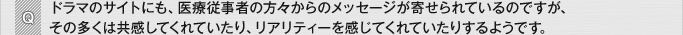 それは僕も嬉しいです。我々の目的にはふたつあって、ひとつは医師としてのプロらしい動きをすること、もうひとつは、脚本の段階かもしれませんし、それ以前にプロデューサーさんとお話をさせてもらったときからかもしれませんけど、僕らの思いをどうお話の中に織り交ぜていくか、ということだと思うんです。いままでの医療ドラマの多くは患者さんが中心で、「患者さんがこうだから…」という視点がずっと続いてきたと思うんです。だから、我々医療側の事情だとか、医療側の思い…もっと言えば医療側の本音だとか、そういう部分はあまりテレビには出てこなかったと思うんです。でもこのドラマはそうじゃなくて、医療側の思いっていうものがもの凄く出ているんですよ。例えば、2話目に白石(新垣結衣)が、患者に向って「いい加減にしてよ。こっちだってひどい目に遭っているんだから」「治療を拒否してこれ以上、悩ませないでよ」って言ってしまったり、3話で冴島(比嘉愛未)がわがままな患者を怒鳴りつけたり、あるいは冴島と白石の間で、「仲良くやろうよ」「じゃあ、言わせてもらいますけど…」みたいなことがあったりとか、普段は思っててもあまり口に出さないようなことをスパッと言っている…言ってもらっているところもありますね。1話の最後で、藍沢(山下智久)が現場で手術をして「おもしろかった…」って言いましたよね。あんなことも公に言うことはないですよ。でも、僕らには、そういう思いもあるわけです。手術が好きだとか、手術が楽しいだとか、そういうことを思っている人もいるんです。でも、患者さんにしてみれば「ちょっと待ってくれよ!こっちが生きるか死ぬかのときに『おもしろい』とは何事だ!」となるので、いままではタブーになっていたんですけど、それをスパッと言ってもらえるというのは、僕らの思いを代弁してくれているので嬉しいですね。僕らが興味を持って仕事が出来ないと、患者さんにもよい結果をもたらすことができないとも思いますし…。