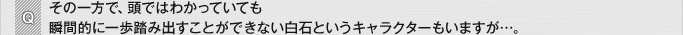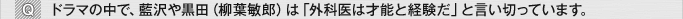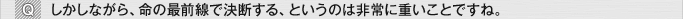 あれもリアルだと思います。若いお医者さんから見れば等身大ですよ。いくら経験を積んでも、わかっていても踏み出せない、っていう人もいますから。ただ、救急医をやっていく上では、一歩どこかで踏み出さなければいないことが必ずあります。一番求められているのは、「決断する才能」だということも事実です。白石がこれからそういったものを身につけて行ってくれることに期待します。