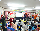 1ヵ所目が、津波被害のため、仮設コンテナで運営されている小野保育所です。みんな朝早かったのか、最初の「おはようございます」の声がやや小さめ。(笑)
