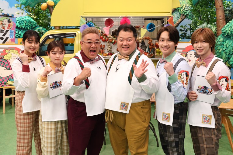 左から)杉原千尋(フジテレビアナウンサー)、井上咲楽、伊達みきお(サンドウィッチマン)、小杉竜一(ブラックマヨネーズ)、藤原丈一郎(なにわ男子)、七五三掛龍也(Travis Japan)