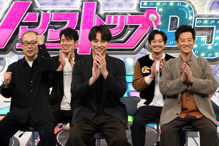 左から)松嶋尚美、名倉潤、谷原章介、鈴木おさむ、武田鉄矢