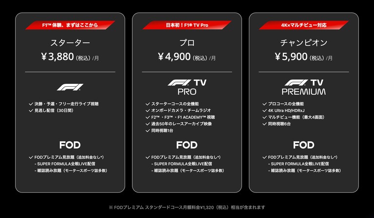 プロコースおよびチャンピオンコースでは、F1™︎公式配信サービス「F1® TV」へのアクセス権が付与された専用アカウントを新たに作成し、FODアカウントと連携。これにより、日本国内からのアクセス制限なく、F1® TVを通じて、オンボードカメラ映像やチームラジオ、各種データ映像など、世界基準の視聴体験をお楽しみいただける。