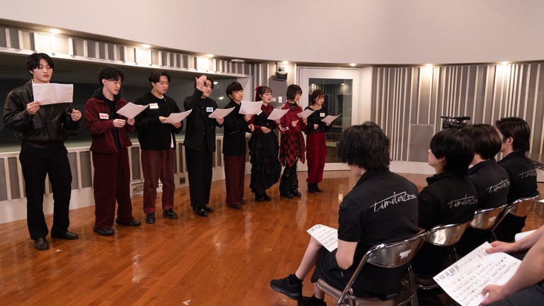 そして今回、このまま黙って引き下がるわけにはいかないと、あまのんが再び「ミュージックシェア」のスタジオに襲来!「絶対リベンジします!」(天音)と真剣なまなざしで宣言するあまのんメンバーを、timeleszの8人は余裕の笑顔で迎える。しかし、今回の課題曲がOfficial髭男dismの『Pretender』だと発表されると、スタジオの空気はにわかにざわつき始め、timeleszメンバーも緊張の面持ちに…。この『Pretender』は、ストリーミング累計再生数10億回超えを記録するほど非常にポピュラーな楽曲でありながら、1曲の中での音階の高低が激しい上に、フラット(半音下げることを意味する変化記号)の付いた音符が多用されており、正確に歌うのが非常に難しい楽曲なのだ。審査員を務める上野実咲先生も「半音の違いをいかに正しく歌えるかがポイント」「繊細な声の使い分けが試される曲」などと解説し、両チームはそれらの言葉をかみしめるようにうなずきながら、それぞれの練習ルームへ向かう。
