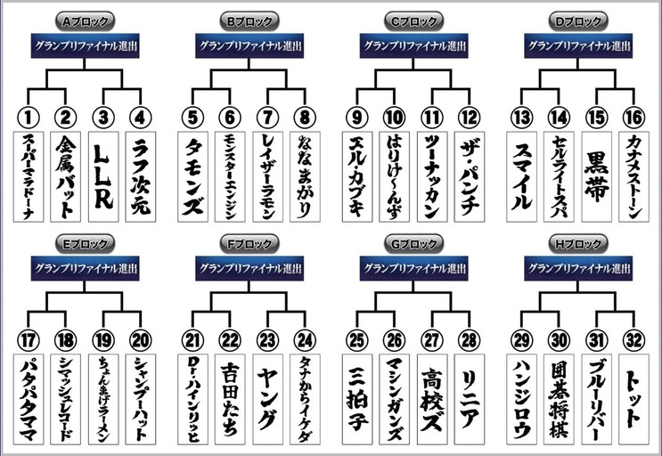 3段目左から)Dr.ハインリッヒ、囲碁将棋、スーパーマラドーナ、ヤング、高校ズ、スマイル、ハンジロウ、LLR