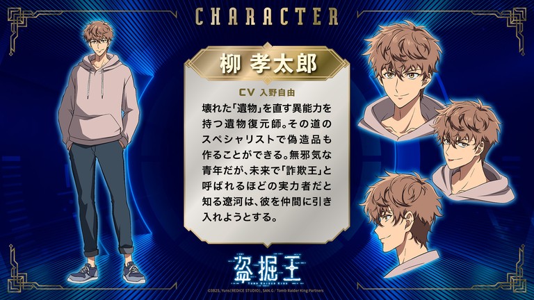 さらに、本作のメインビジュアル第1弾が公開された!ビジュアルには、さまざまな「遺物」を背に大金を手にする遼河が描かれており、彼が「盗掘王」となるまでの行く末を感じさせる内容となっている。そして、キャラクター紹介PVでは、世界各地に謎の「墓」が現れ、その中にある「遺物」が所有者に異能力を与える世界で、過去の知識を持ちながら15年前にタイムスリップして復讐(ふくしゅう)を誓う主人公の遼河に加えて、未来では「破産王」と呼ばれていたアイリーン・ホルトン(CV.早見沙織)、同じく未来で「詐欺王」と呼ばれていた孝太郎、チンピラでタイムスリップ後は遼河の子分となる昇、遼河の復讐(ふくしゅう)相手である大河原泰政(おおがわら・たいせい/CV.諏訪部順一)など、本作で「遺物」を取り巻く魅力的なキャラクターたちが大迫力の映像と共に登場する。