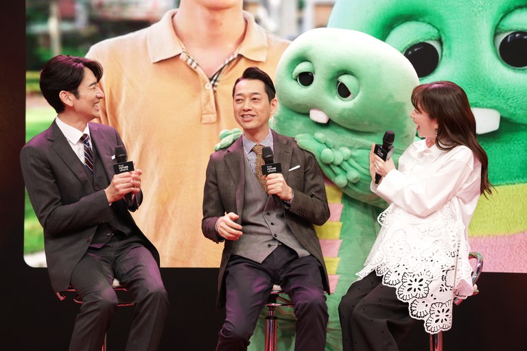 左から)生田竜聖(フジテレビアナウンサー)、設楽統、ガチャピン、三上真奈(フジテレビアナウンサー)