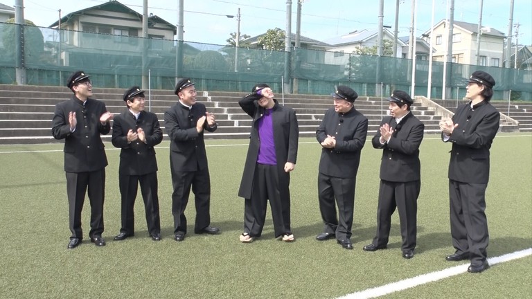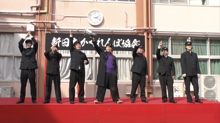 「おかえり隠密マサル」の横断幕と花吹雪で迎えられ、長田は28年ぶりに母校、京都先端科学大学付属中学校・高等学校に帰還。