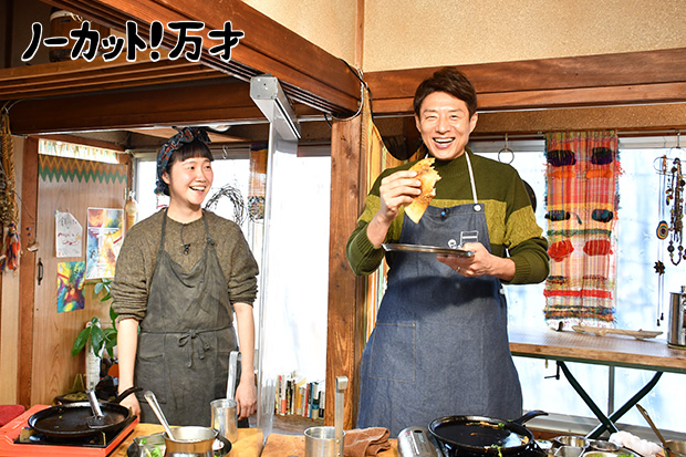 - 今回の「ノーカット!万才」は、インドのクレープ「チーズドーサ」に挑戦!高知県南国市の井口さんに教わりながら、料理を作って食べるまで2分半ノーカットの勝負です。「ドーサ」は米と豆をすり潰した粉を発酵させた生地をクレープ状に焼き、具材やスパイスをトッピングした料理。はじめて手にする鉄板やヘラに悪戦苦闘しながら、欲張りにのせ過ぎた具材をなんとか包もうとがんばりました!出来上がりは、クリスピーな生地とパクチーや赤玉ねぎなどのシャキシャキ感、それにエスニックなスパイスをとろりとしたチーズが包んでくれて大満足!・・・なのですが、そこまで入りきりませんでした!