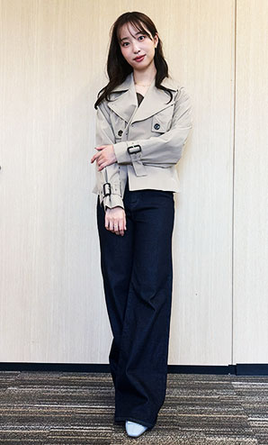 小顔効果のある大きめの襟やペプラムのように少し広がる裾で、定番のトレンチコートを素敵に更新。インディゴデニムを合わせるベーシックな着こなしも、どこか洗練された印象に。すっきり見せてくれるショート丈も◎。