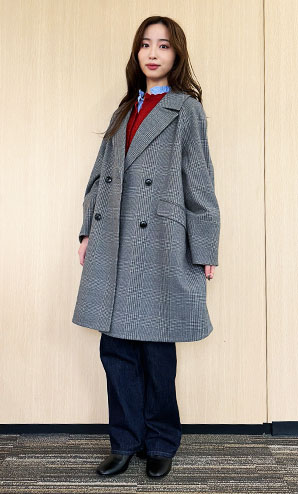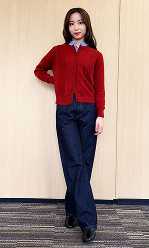 をのぞかせた、上品なトラッドスタイル。カーディガンにはフリルシャツをレイヤードして洒落感アップ。赤×ブルーの上級者なカラーMIXも手伝って一歩先ゆく印象に。