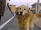 朝焼けの中、線路沿いの道を歩く一匹のわんこ。