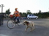 自転車に乗ったご主人と一緒に畦道をダッシュ。
