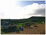 ここで馬たちをトラックから降ろします。何と「ハチチ」はご主人と一緒に馬に乗り海岸へ向かうんです。 家族も同然の馬に乗ることは「ハチチ」にとってお手の物。