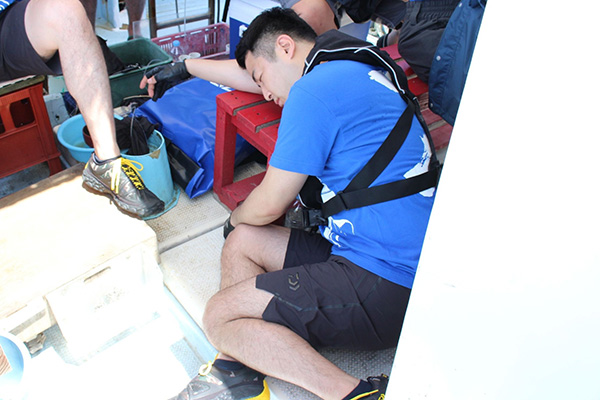 開始からしばらくは、それぞれが自分の釣り竿に集中して、船上の会話もほとんどありません。手応えがないまま2時間がたった頃、ようやく宮川さんと川西さんほぼ同時に初のヒット! 偶然にも二人仲良くツムブリという同じ魚で、「よっしゃー!」とテンションがあがります。そして、船酔いからなんとか復活した水田さんの竿に獲物がかかると、宮川さんと川西さんがすぐに駆け寄り、「頑張れー!」「もっと糸巻いて!」と全力でエールを送ります。そして、釣り上げた瞬間には大きな歓声を上げ、3人同時にガッツポーズ! 序盤には見られなかったチームの一体感が、自然と生まれていました!