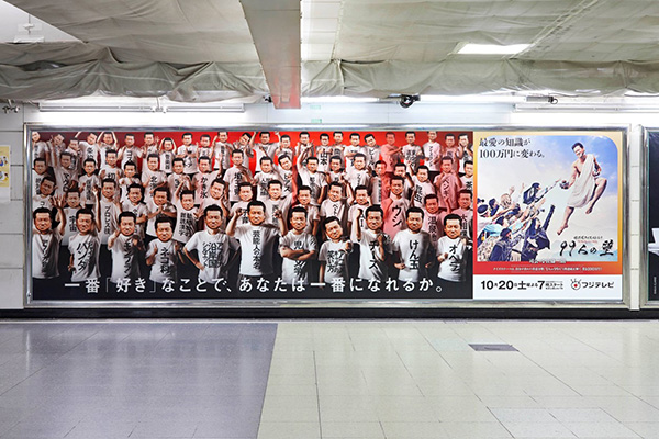 初回放送に先がけ、JR新宿駅改札内に『超逆境クイズバトル!! 99人の壁』の限定広告が出現! MCを務める佐藤二朗さんの姿が、見る角度によって増えていくという仕掛けが施されています。この不思議な広告には、CDのジャケットやトレーディングカード等にもよく使われている“レンチキュラー”という特殊印刷方法を採用。問題数が進むにつれてチャレンジャーの解答を阻む“壁(=クイズ参加者)”が増えていくさまを表現しています。この『超逆境クイズバトル!! 99人の壁』限定交通広告は、10月15日(月)~10月21日(日)の期間にかけて<JR新宿駅西口改札内北通路>にて公開中! お立ち寄りの際は是非お見逃しなく。(※駅係員へのお問い合わせはご遠慮ください)
