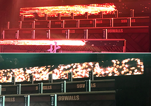 セットに組み込まれたLEDビジョン。司会者の掛け声に合わせて火花が散ったり、光が舞ったりする映像演出で、音響とともに会場を盛り上げています。