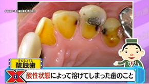 さらに酸性状態のまま歯磨きをしてしまうと、最悪の場合「酸蝕歯」(さんしょくし)になってしまう可能性が!「酸蝕歯」(さんしょくし)とは、酸性状態によって溶けてしまった歯のこと。最悪の場合、知覚過敏や歯がすべて溶けてしまうこともあるという!