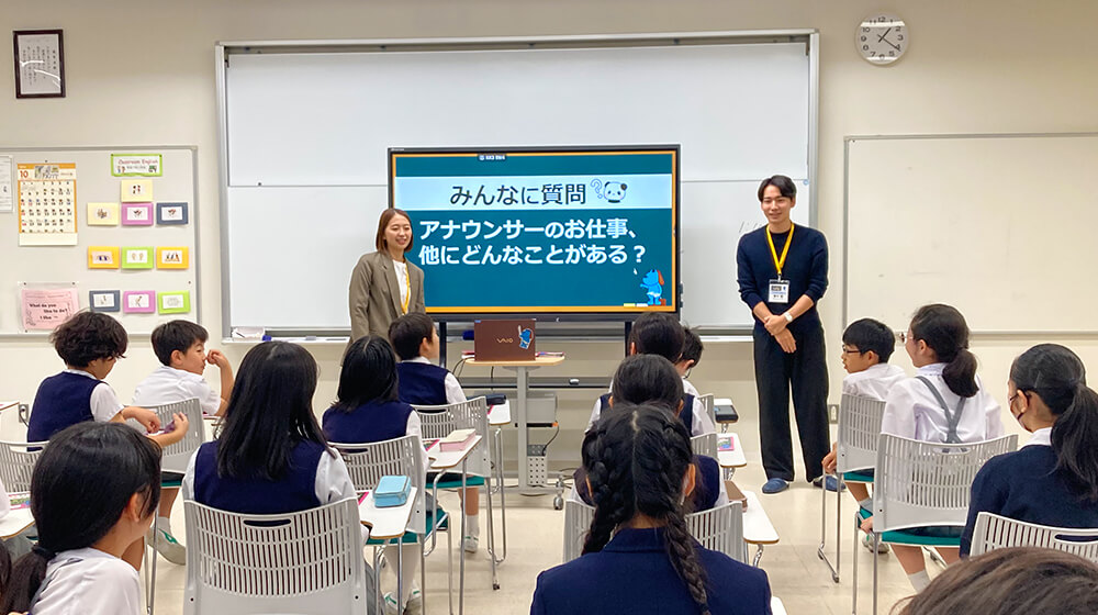 さて授業ですが6年生に向けて「インタビュー&スピーチ講座」でした。「仕事」というテーマについて、私にインタビューそして、インタビューした内容をスピーチするというものでした。最初は少し緊張気味だったのですが、だんだんと手が上がり初めて、堂々とスピーチしてくれました。目を輝かせて「アナウンサーという仕事」について、聞いてくれてこちらも考えさせられる良い機会になりました。
